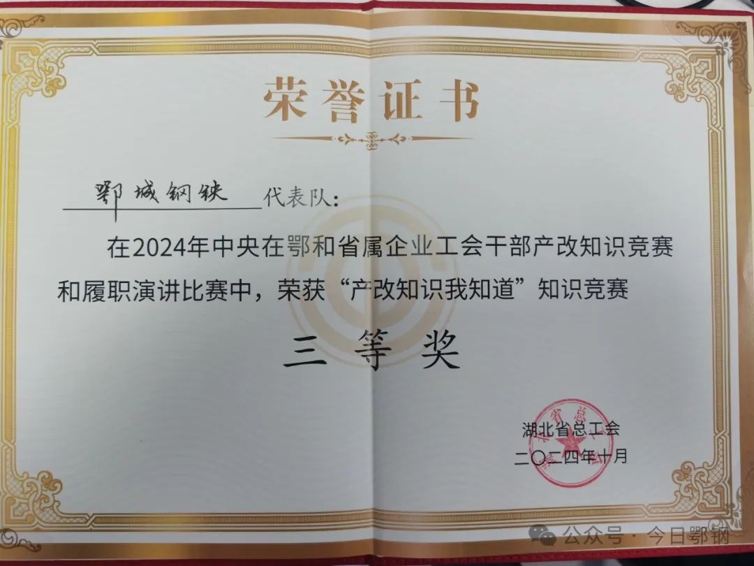 10月13日,在湖北省總工會組織的中央在鄂和省屬企業產改知識競賽上,鄂鋼代表隊勇奪三等獎。