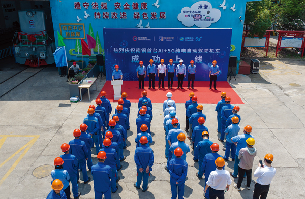 圖為南鋼AI+5G純電自動駕駛機車上線儀式現(xiàn)場。