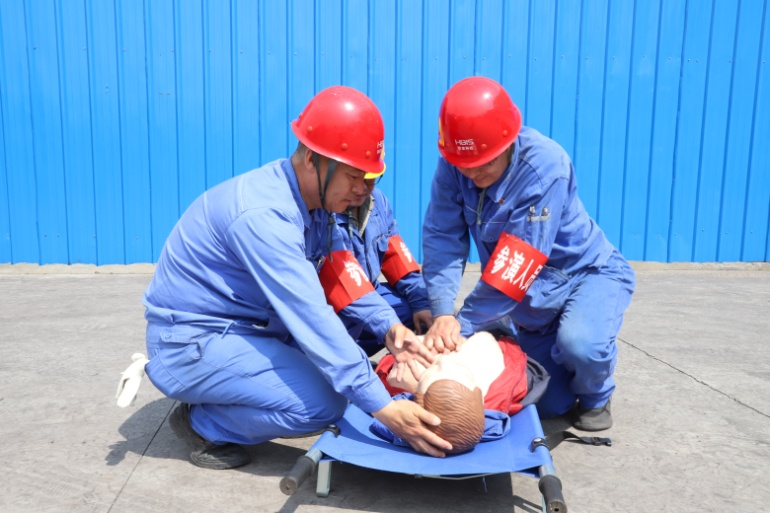 “心臟驟停的黃金救援時(shí)間僅有4分鐘!”在張宣科技機(jī)電公司演練現(xiàn)場(chǎng),當(dāng)?shù)厮{(lán)天救援隊(duì)隊(duì)員手持假人模型,一邊演示心肺復(fù)蘇(CPR)操作,一邊大聲提醒周圍的職工。 “咚、咚……”一陣按壓聲,職工們同步練習(xí)手部動(dòng)作。