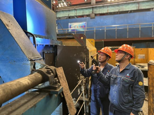 方大特鋼軋鋼廠設備部部長陽志清帶著徒弟劉羅軍到軋鋼廠彈扁線進行設備巡檢 李亞洲 攝