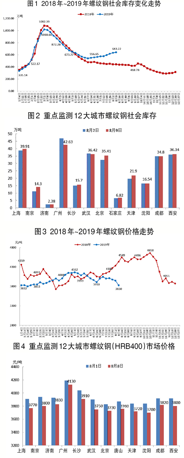 8月5日~8月9日,螺紋鋼社會(huì)庫(kù)存為643.22萬(wàn)噸,環(huán)比增加10.07萬(wàn)噸,升幅為1.59%。重點(diǎn)監(jiān)測(cè)的12個(gè)城市庫(kù)存升降不一,其中廣州庫(kù)存降幅較大,南京、北京、天津升幅較大。