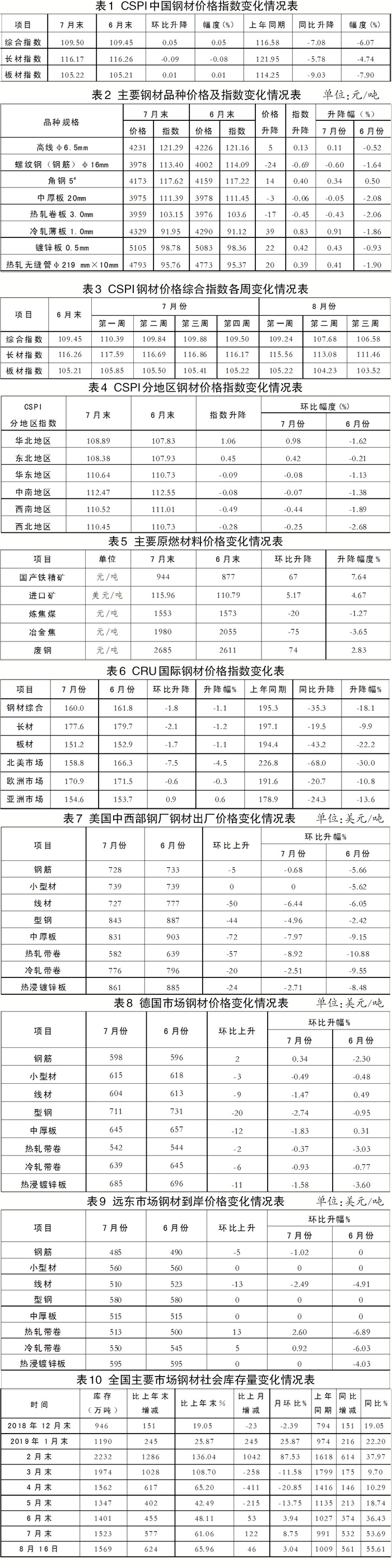 各周鋼材價(jià)格指數(shù)變化情況。7月份,CSPI國(guó)內(nèi)鋼材價(jià)格指數(shù)在第一周小幅上升,第二周、第三周、第四周持續(xù)下降。進(jìn)入8月份,鋼材價(jià)格繼續(xù)呈小幅下行走勢(shì)。(見表3)