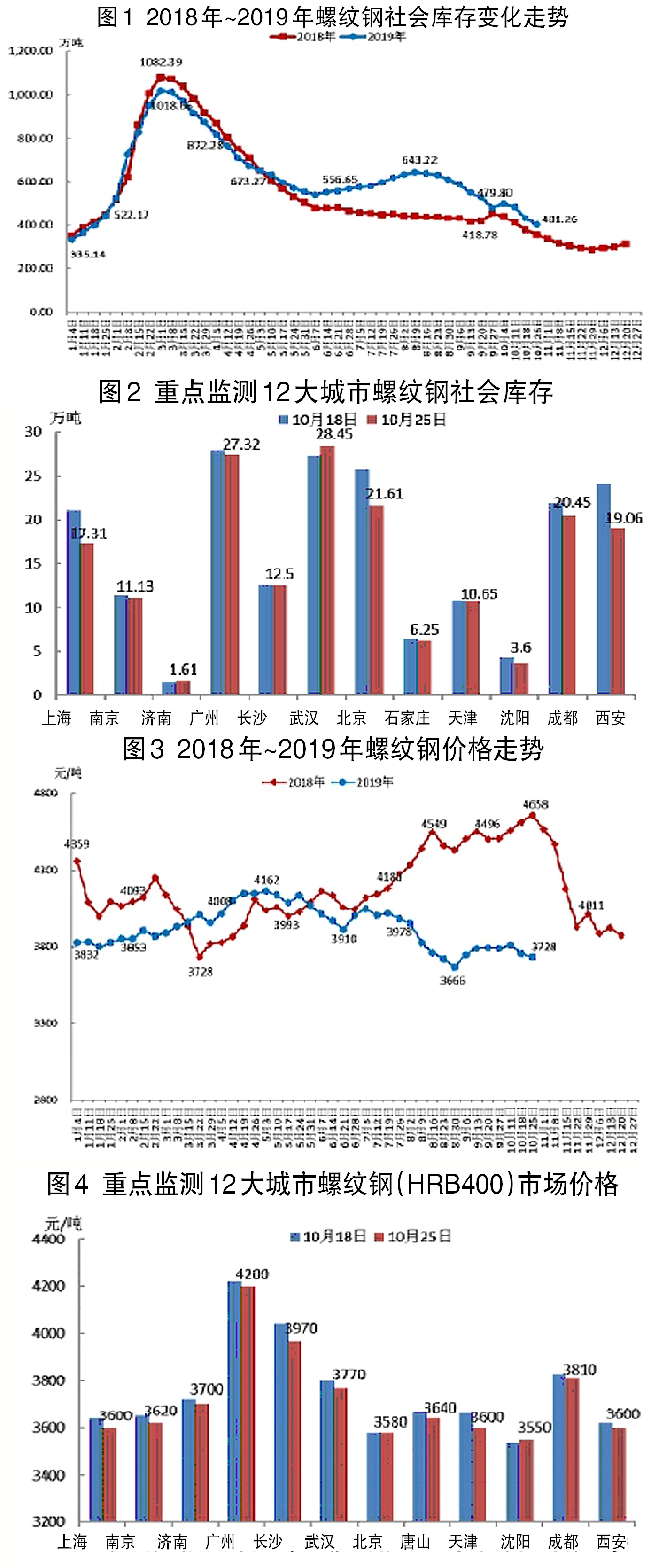 10月21日~10月25日,螺紋鋼社會庫存為401.26萬噸,環(huán)比下降30.70萬噸,降幅為7.11%。其中重點(diǎn)監(jiān)測的12個城市庫存升降不一,西安、北京、上海等降幅較大,武漢升幅較大。