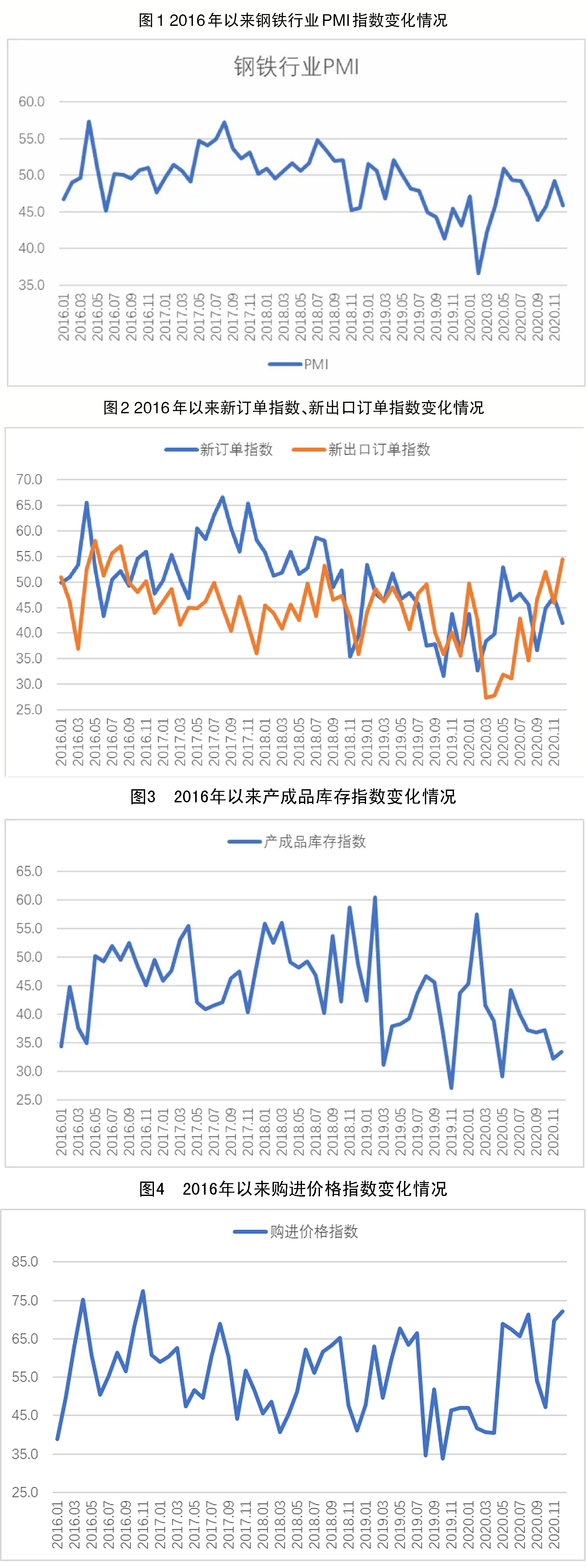 2020年12月份,隨著天氣逐漸轉冷,需求整體有隨著冬季深入而自然下降的趨勢。當月內鋼材價格明顯上升,進一步導致鋼材市場需求減少。結合來看,當前國內鋼材市場需求偏謹慎,新訂單指數為42.0%,環比下降5.2個百分點。國外主要經濟體經濟仍處于復蘇態勢,制造業有所好轉,汽車銷量增加,帶動了相關鋼材需求,我國鋼材出口短期內較快上升。新出口訂單指數為54.4%,環比上升8.5個百分點。