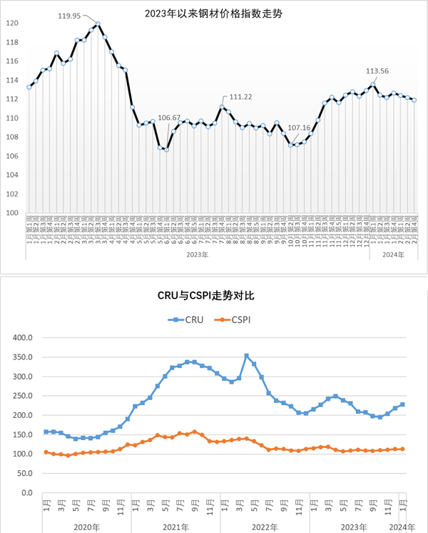 從國際市場來看,2024年1月份,CRU國際鋼材價格指數(shù)為227.9點,環(huán)比上漲9.2點,漲幅為4.2%,環(huán)比連續(xù)3個月回升;比去年底上漲9.2點,漲幅為4.2%;同比上漲11.9點,漲幅為5.5%。其中,CRU長材價格指數(shù)為218.8點,環(huán)比上漲5.0點,漲幅為2.3%;同比下降21.1點,降幅為8.8%。CRU板材價格指數(shù)為232.2點,環(huán)比上漲11.1點,漲幅為5.0%;同比上漲28.1點,漲幅為13.8%。分地區(qū)來看,2024年1月份,北美地區(qū)價格指數(shù)為289.6點,環(huán)比上漲19.3點,漲幅為7.1%;歐洲地區(qū)價格指數(shù)為236.6點,環(huán)比上漲7.7點,漲幅為3.4%;亞洲地區(qū)價格指數(shù)為186.9點,環(huán)比上漲4.2點,漲幅為2.3%。