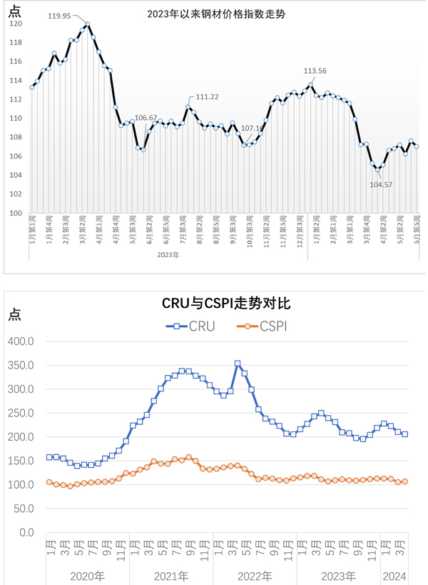 當(dāng)周,中國鋼材價(jià)格指數(shù)(CSPI)為107.03點(diǎn),周環(huán)比下降0.59點(diǎn),降幅為0.55%;比上月末上漲0.25點(diǎn),漲幅為0.23%;比去年底下降5.87點(diǎn),降幅為5.20%;同比上漲0.14點(diǎn),漲幅為0.13%。其中,長(zhǎng)材價(jià)格指數(shù)為110.91點(diǎn),周環(huán)比下降0.63點(diǎn),降幅為0.57%;比上月末上漲1.51點(diǎn),漲幅為1.38%;比去年底下降5.20點(diǎn),降幅為4.48%;同比上漲1.21點(diǎn),漲幅為1.10%。板材價(jià)格指數(shù)為104.51點(diǎn),周環(huán)比下降0.60點(diǎn),降幅為0.57%;比上月末下降0.47點(diǎn),降幅為0.45%;比去年底下降7.29點(diǎn),降幅為6.52%;同比下降3.09點(diǎn),降幅為2.87%。