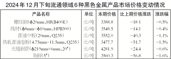 2024年12月下旬,φ20毫米HRB400E螺紋鋼本期價格為3388.8元/噸,環比下降18.1元/噸,降幅為0.5%;φ8毫米—φ10毫米HPB300線材本期價格為3548.5元/噸,環比下降14.1元/噸,降幅為0.4%;20毫米Q235普通中板本期價格為3552.0元/噸,環比下降40.3元/噸,降幅為1.1%;4.75毫米—11.5毫米Q235熱軋普通卷板本期價格為3477.7元/噸,環比下降51.7元/噸,降幅為1.5%;φ219毫米×φ6毫米20#無縫鋼管本期價格為4281.9元/噸,環比下降24.4元/噸,降幅為0.6%;5#角鋼本期價格為3560.3元/噸,環比下降56.8元/噸,降幅為1.6%。 (郭同炬)