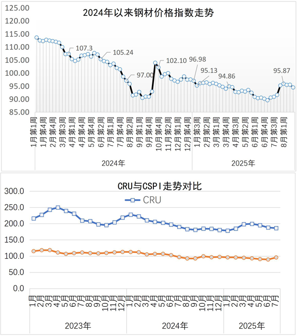 當周,中國鋼材價格指數(CSPI)為94.41點,周環比下降1.05點,降幅為1.10%;比上月末下降1.46點,降幅為1.52%;比去年底下降3.06點,降幅為3.14%;同比上漲2.73點,漲幅為2.98%。其中,長材價格指數為95.47點,周環比下降1.48點,降幅為1.53%;比上月末下降2.07點,降幅為2.12%;比去年底下降4.75點,降幅為4.74%;同比上漲0.74點,漲幅為0.78%。板材價格指數為93.33點,周環比下降0.90點,降幅為0.95%;比上月末下降1.17點,降幅為1.24%;比去年底下降2.22點,降幅為2.32%;同比上漲4.47點,漲幅為5.03%。