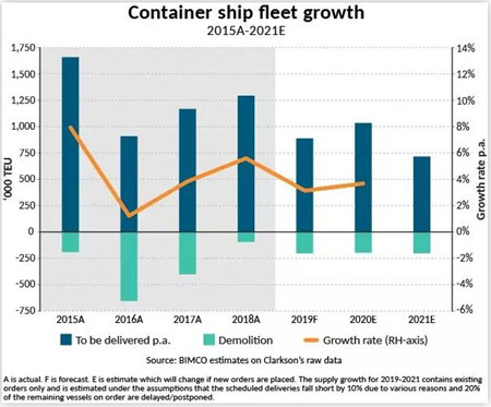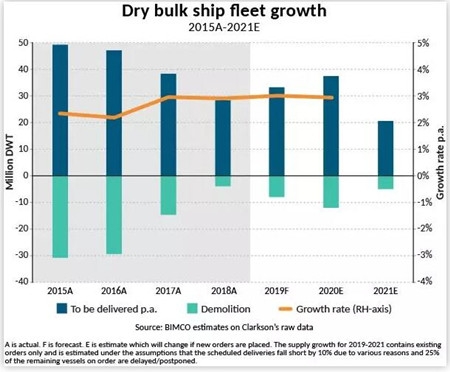 在上述假設(shè)下,BIMCO預(yù)計2019和2020年的干散貨船運力增速為3%左右。