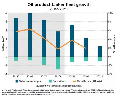 幸運的是,油輪的新訂單不多。今年1至4月,新簽造船訂單只有470萬載重噸,油輪的總手持訂單量減少了10.3%。市場明顯的運力過剩意味著不需要新船訂單。BIMCO估計,2020至2021年,運力增速將放緩,因為新簽訂單有所減少。