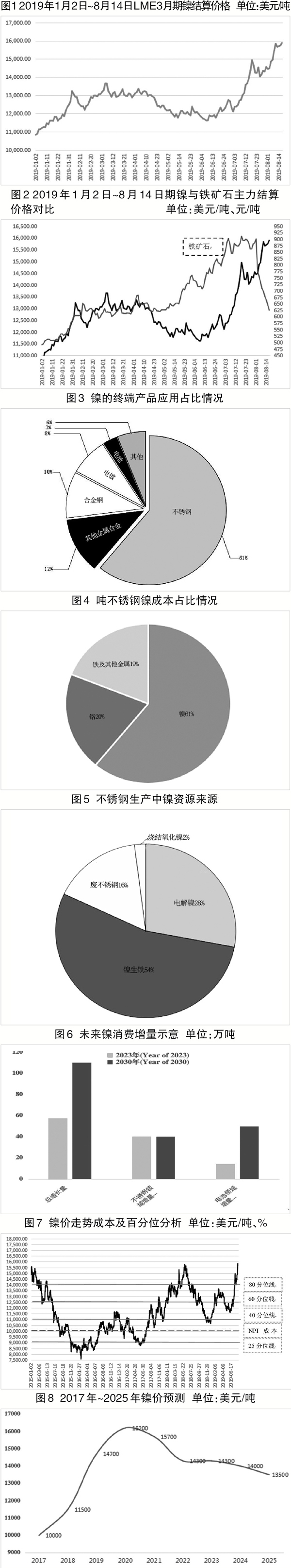 長(zhǎng)期來(lái)看,由于傳統(tǒng)硫化鎳礦和紅土鎳礦的成本限制,在沒(méi)有巨大市場(chǎng)需求的刺激下,鎳價(jià)很難停留在18000美元/噸的較高價(jià)位區(qū)間。預(yù)計(jì)2019年~2022年鎳年均價(jià)將分別為14500美元/噸~15000美元/噸、16000美元/噸~16500美元/噸、15500美元/噸~16000美元/噸、14000美元/噸~15000美元/噸,2025年的均價(jià)或?qū)⒂捎诠┬璧闹匦缕胶舛芈渲?3500美元/噸。