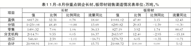 分品種看,1月~8月份,重點(diǎn)鋼鐵企業(yè)長材按銷售渠道占比大小排序依次是:分銷、直供、分支機(jī)構(gòu)、零售、出口。其中,長材零售占比同比提高最大,提高了1.06個百分點(diǎn);出口占比同比下降最大,下降了1.01個百分點(diǎn)。與去年相比,通過零售渠道銷售的長材數(shù)量增幅最大,上升36.13%。