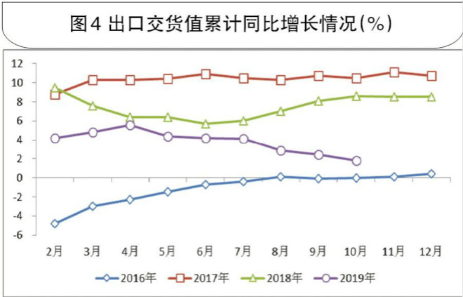 10月份,我國出口交貨值1.09萬億元,同比下降3.80%(去年同期為同比增長(zhǎng)14.70%),降幅環(huán)比擴(kuò)大3.10個(gè)百分點(diǎn)。這與通信設(shè)備、計(jì)算機(jī)及其他電子設(shè)備制造業(yè)受中美貿(mào)易摩擦影響出口交貨值增速由正轉(zhuǎn)負(fù)有關(guān)。自8月份以來,出口交貨值同比增速一直處在負(fù)增長(zhǎng)區(qū)間,導(dǎo)致出口交貨值累計(jì)同比增速連續(xù)回落。1月~10月份,我國出口交貨值累計(jì)達(dá)到10.11萬億元,同比增長(zhǎng)1.80%,增速比去年同期大幅回落6.80個(gè)百分點(diǎn),比前三季度回落0.60個(gè)百分點(diǎn),且有進(jìn)一步回落的可能。