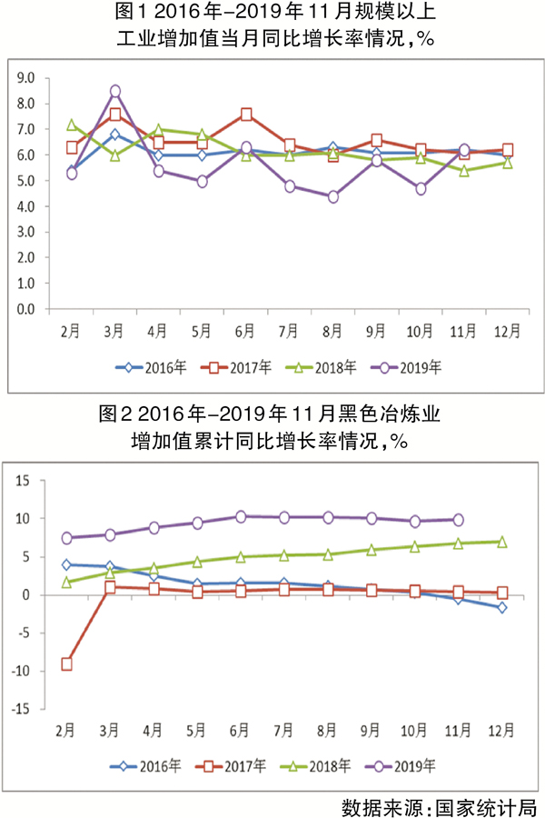 從部分制造業子行業增加值累計同比情況來看,2019年1月~11月,黑色金屬冶煉和壓延加工業(以下簡稱黑色冶煉業)增加值同比增長9.9%,增速較2018年同期加快3.1個百分點。黑色冶煉業增加值同比增速與相關下游用鋼行業相比,低于同期電氣機械及器材制造業(同比增長10.4%),高于鐵路、船舶、航空航天和其他運輸設備制造業(同比增長9.0%)、專用設備制造業(同比增長7.0%)、金屬制品業(同比增長5.7%)、通用設備制造業(同比增長4.1%)、汽車制造業(同比增長0.7%)。多數下游主要用鋼行業增加值增速低于黑色冶煉業。汽車制造業增加值同比增速轉正,主要與2019年11月汽車產量同比增速轉正有關。