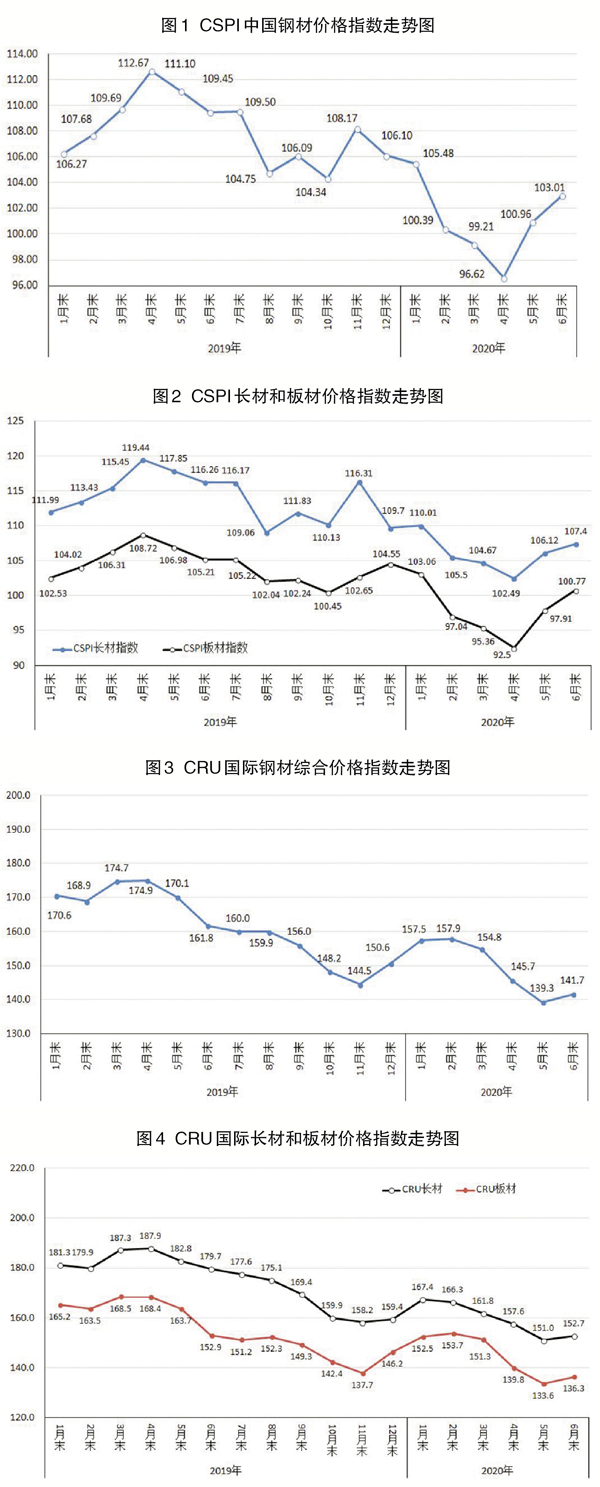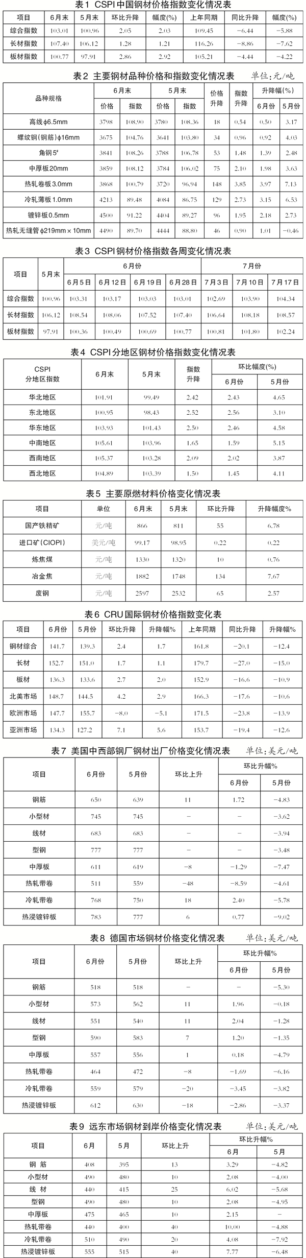 從全月情況看,6月份中國鋼材價格指數(CSPI)平均值為103.13點,比5月份回升3.30點,升幅為3.31%。1月~6月份平均值為100.95點,同比下降8.53點,降幅為7.79%。