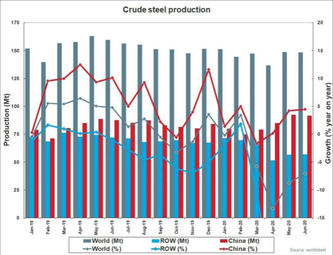 2020年6月全球64個(gè)納入世界鋼鐵協(xié)會(huì)統(tǒng)計(jì)國家的粗鋼產(chǎn)量為1.483億噸,同比下降7.0%。由于新冠疫情造成的影響持續(xù)進(jìn)行中,本月發(fā)布的許多產(chǎn)量數(shù)據(jù)為預(yù)估值,我們可能會(huì)在下個(gè)月的產(chǎn)量報(bào)告中對數(shù)據(jù)進(jìn)行修訂。
