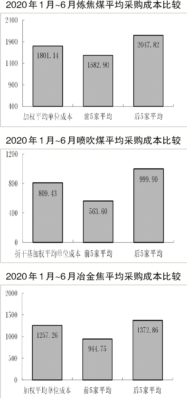 1月~6月份,對(duì)標(biāo)企業(yè)冶金焦平均采購(gòu)成本最低的前5家企業(yè)的加權(quán)平均采購(gòu)成本為1582.90元/噸,比對(duì)標(biāo)企業(yè)平均采購(gòu)成本低218.24元/噸,降低幅度為12.12%;而采購(gòu)成本最高的5家企業(yè)的加權(quán)平均采購(gòu)成本為2047.82元/噸,比對(duì)標(biāo)企業(yè)平均采購(gòu)成本高246.68元/噸,高于平均采購(gòu)成本的13.70%。