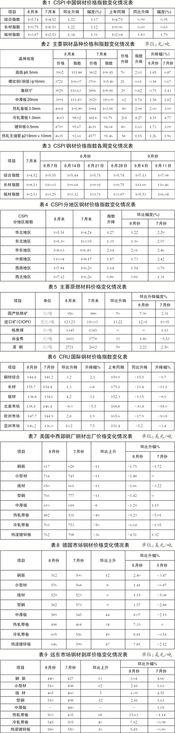 8月末,CSPI長材指數為109.75點,環比上升1.22點,升幅為1.12%;CSPI板材指數為103.87點,環比上升1.34點,升幅為1.31%,比長材價格升幅高0.19個百分點。與去年同期相比,長材指數上升0.69點,升幅為0.63%;板材指數上升1.83點,升幅為1.79%。(見圖2、表1)