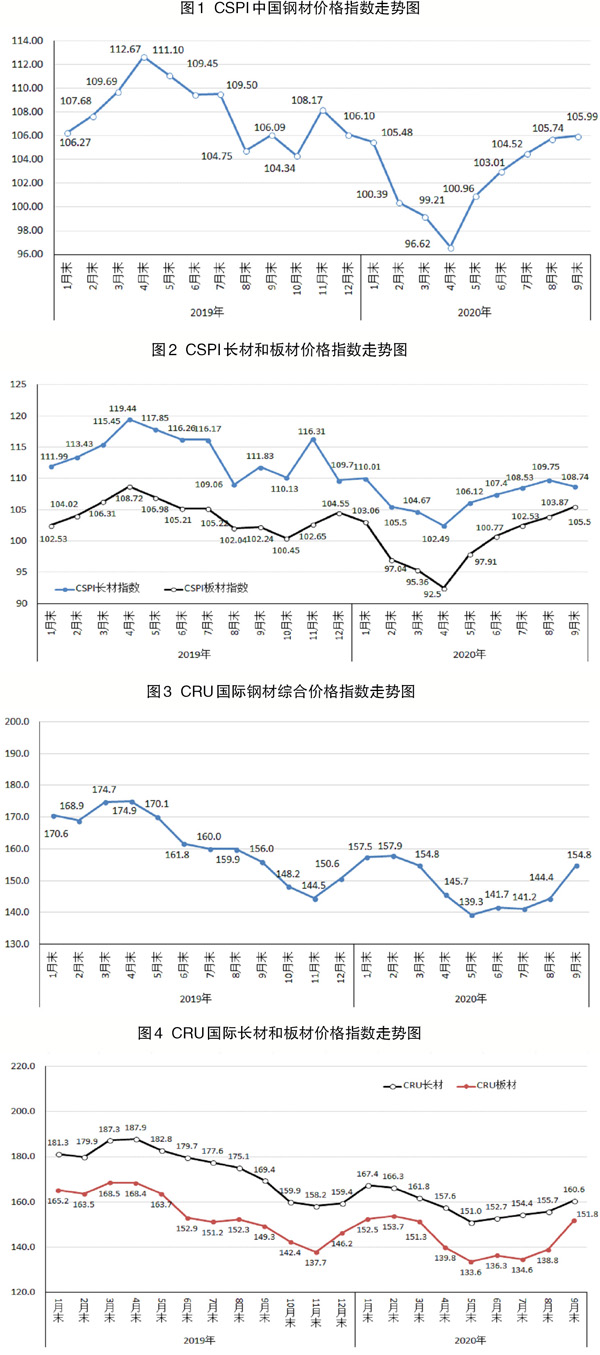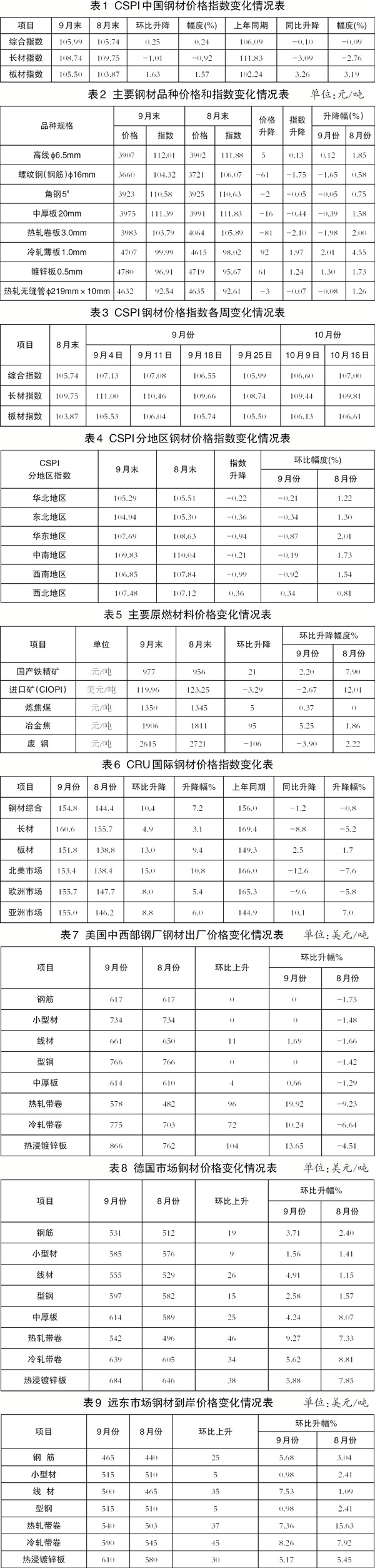 據鋼協監測,9月末,中國鋼材價格指數(CSPI)為105.99點,環比上升0.25點,升幅為0.24%,較8月份縮窄0.93個百分點;與去年同期相比下降0.10點,降幅為0.09%。(見圖1)