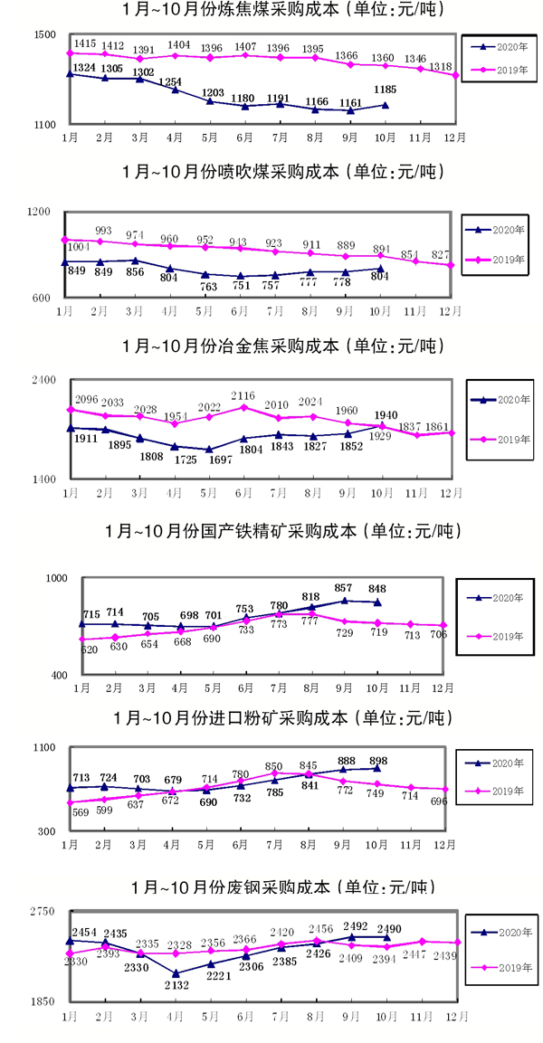 1月~10月份,煉焦煤累計采購成本同比下降11.95%;冶金焦同比下降8.78%;國產(chǎn)鐵精礦同比升高8.61%,進(jìn)口粉礦同比升高6.34%;廢鋼同比下降0.41%。