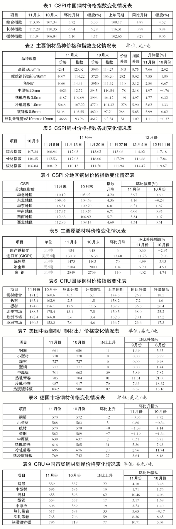 11月份,CRU亞洲鋼材價(jià)格指數(shù)為160.3點(diǎn),環(huán)比上升7.0點(diǎn),升幅為4.6%。日本制造業(yè)PMI為49.0%,環(huán)比上升0.3個(gè)百分點(diǎn);韓國(guó)制造業(yè)PMI為52.9%,環(huán)比上升1.7百分點(diǎn);中國(guó)制造業(yè)PMI為52.1%,較10月上升0.7個(gè)百分點(diǎn)。當(dāng)月中國(guó)市場(chǎng)主要鋼材品種價(jià)格均有所上升。(見(jiàn)表9)