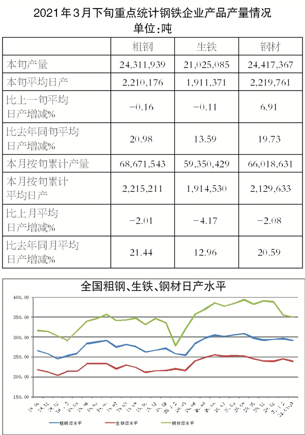 3月下旬,重點(diǎn)統(tǒng)計(jì)鋼鐵企業(yè)共生產(chǎn)粗鋼2431.19萬(wàn)噸、生鐵2102.51萬(wàn)噸、鋼材2441.74萬(wàn)噸。當(dāng)旬平均日產(chǎn),粗鋼221.02萬(wàn)噸,環(huán)比下降0.16%、同比增長(zhǎng)20.98%;生鐵191.14萬(wàn)噸,環(huán)比下降0.11%、同比增長(zhǎng)13.59%;鋼材221.98萬(wàn)噸,環(huán)比增長(zhǎng)6.91%、同比增長(zhǎng)19.73%。