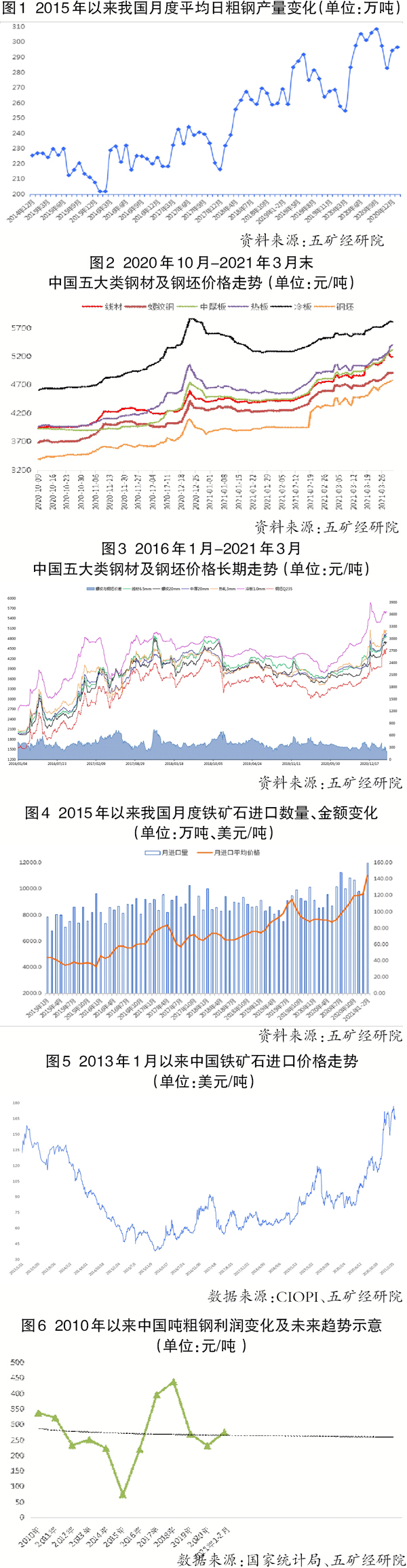 在前兩個月的全國粗鋼產量中,河北、江蘇、山東3省分別以4033.35萬噸、2029.07萬噸、1319.01萬噸排名前3位,粗鋼總產量占全國的近43%,這也是近期在唐山提出嚴格環保限產后江蘇省相應提出限產的重要原因之一。同期,我國鋼材產量為20953萬噸,同比增長23.6%。經計算,2021年1月~2月份我國累計日產粗鋼296.6萬噸,較2020年同期增加了近40萬噸。但是,2021年1月~2月份按同期黑色金屬冶煉和壓延加工業行業利潤計算的粗鋼利潤僅為275元/噸,與2019、2020年全年噸粗鋼利潤處于同一水平。