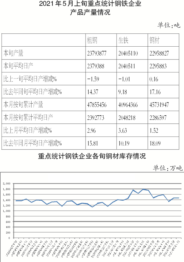 根據重點統計鋼鐵企業產量估算,本旬全國共生產粗鋼3233.44萬噸,日產粗鋼323.34萬噸、環比下降1.26%、同比增長17.20%;生產生鐵2528.11萬噸,日產生鐵252.81萬噸、環比下降0.85%、同比增長9.94%;生產鋼材3948.28萬噸,日產鋼材394.83萬噸、環比增長0.08%、同比增長17.75%。5月累計平均日產,全國粗鋼環比下降0.23%、同比增長14.98%,生鐵環比增長0.26%、同比增長5.17%,鋼材環比下降2.37%、同比增長12.10%。