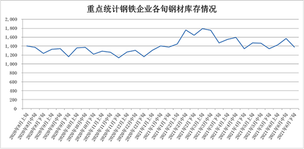 本旬,重點統計鋼鐵企業鋼材庫存量1569.70萬噸,比上一旬增加146.73萬噸,增長10.31%;比5月底增加228.32萬噸,增長17.02%;比年初增加407.60萬噸,增長35.07%;比去年同期增加277.80萬噸,增長21.50%。