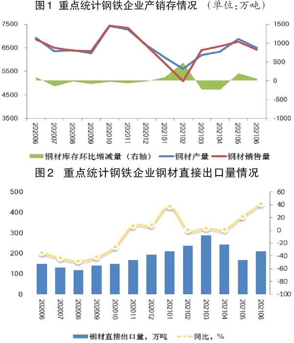1月~6月份,重點統計鋼鐵企業國內鋼材銷售量的同比增幅大于鋼材產量的同比增幅,表明重點統計鋼鐵企業增產的鋼材在國內市場得到了消化;同時,鋼材直接出口量同比上升,隨著全球經濟復蘇,國際市場需求增長也促進了我國鋼鐵企業生產。