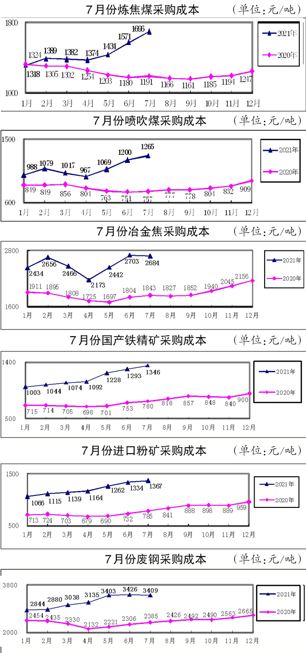 1月~7月份,煉焦煤累計(jì)采購(gòu)成本同比增長(zhǎng)16.43%;冶金焦同比增長(zhǎng)39.02%;國(guó)產(chǎn)鐵精礦同比增長(zhǎng)60.37%,進(jìn)口粉礦同比增長(zhǎng)68.48%;廢鋼同比增長(zhǎng)37.91%。