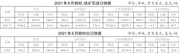 根據海關統計快訊數據,8月份,我國進口鋼材106.3萬噸,環比增加1.4萬噸,增長1.3%;均價為1440.7美元/噸,環比上漲91.8美元/噸,提高6.8%。1月~8月份,我國累計進口鋼材946.0萬噸,同比減少272.6萬噸,下降22.4%。
