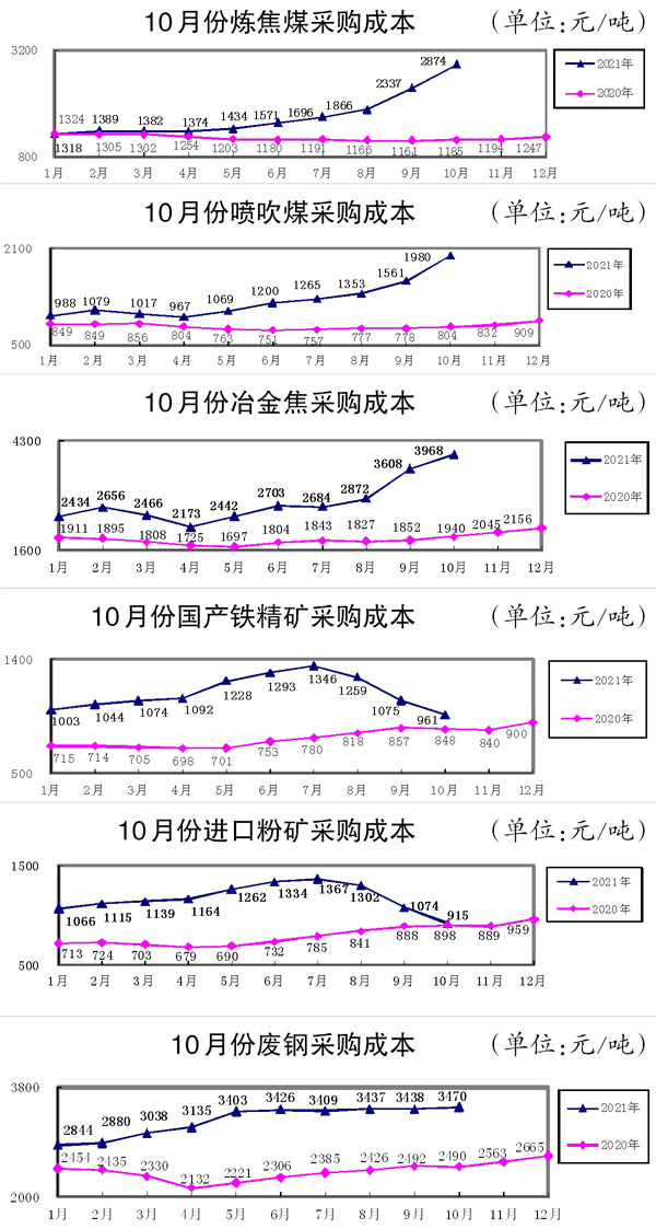 1月~10月份,煉焦煤累計采購成本同比增長41.25%;冶金焦同比增長51.82%;國產鐵精礦同比增長50.41%,進口粉礦同比增長53.32%;廢鋼同比增長37.23%。