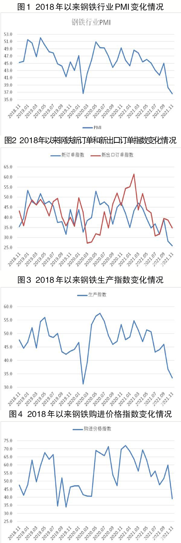 從本會調查、發布的鋼鐵行業PMI(采購經理指數)來看,11月份PMI為36.6%,環比下降1.7個百分點,鋼鐵行業繼續弱勢運行。分項指數顯示,隨著多地入冬,市場需求整體不佳,鋼鐵生產在環保限產等政策影響下繼續下降。原材料成本明顯回落,鋼材價格也一路下行。預計12月份,鋼材市場繼續低位運行,供需兩端繼續趨弱,原材料價格或將趨穩回升,鋼材價格小幅震蕩。