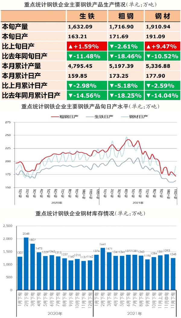 11月下旬,重點統計鋼鐵企業共生產粗鋼1716.90萬噸、生鐵1632.09萬噸、鋼材1910.94萬噸。其中,粗鋼日產171.69萬噸,環比下降2.61%;生鐵日產163.21萬噸,環比增長1.59%;鋼材日產191.09萬噸,環比增長9.47%。