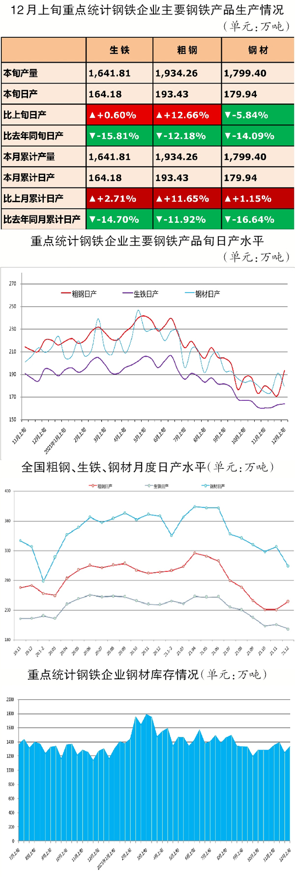 12月上旬, 重點(diǎn)統(tǒng)計(jì)鋼鐵企業(yè)共生產(chǎn)粗鋼1934.26萬(wàn)噸、生鐵1641.81 萬(wàn)噸、鋼材1799.40 萬(wàn)噸。其中,粗鋼日產(chǎn)193.43萬(wàn)噸,環(huán)比上升 12.66%(由于寶武集團(tuán)等少數(shù)企業(yè)粗鋼產(chǎn)量大幅增加,本旬粗鋼日產(chǎn)量環(huán)比增幅較大。若剔除寶武這個(gè)因素,同口徑比較,本旬波動(dòng)在正常范圍內(nèi));生鐵日產(chǎn)164.18 萬(wàn)噸,環(huán)比上升0.60%;鋼材日產(chǎn)179.94 萬(wàn)噸, 環(huán)比下降5.84%(受鞍鋼集團(tuán)ERP取數(shù)原則和部分企業(yè)月底集中入庫(kù)等因素影響,本旬鋼材產(chǎn)量相比上一旬有所減少;剔除這些因素,本旬鋼材產(chǎn)量比上一旬減少2.0%左右)。