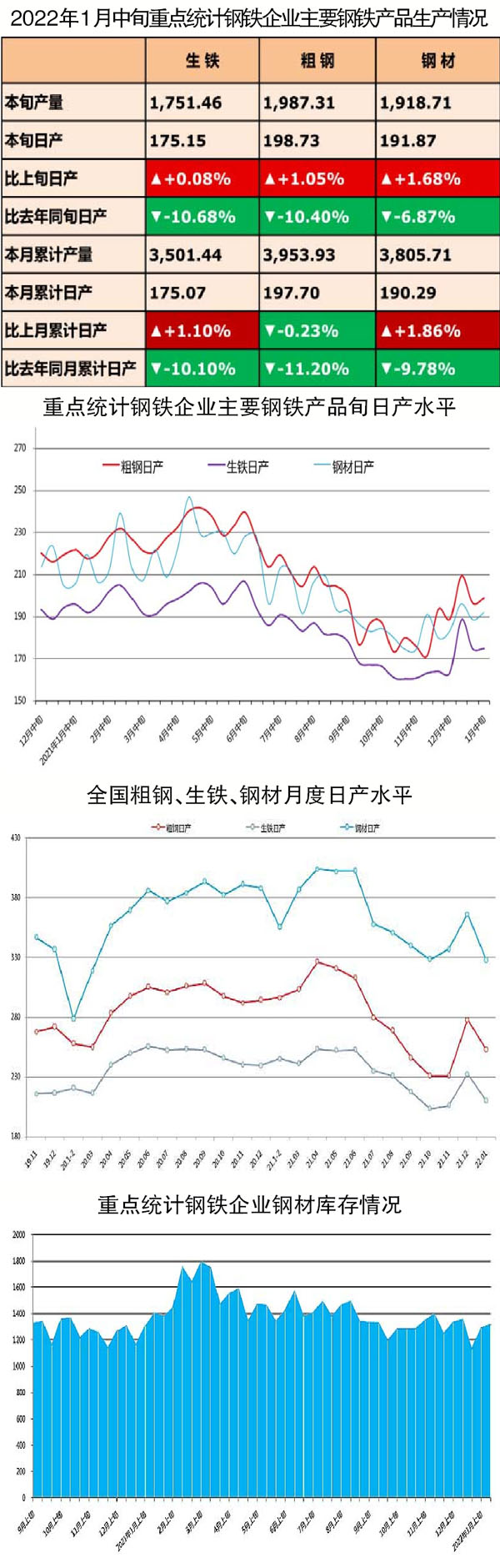 根據2022年1月中旬旬報的統計,2022年1月份(即累計到2022年1月中旬)重點統計鋼鐵企業累計粗鋼日產197.70萬噸,環比下降0.23%,同比下降了11.20%;生鐵日產175.07萬噸,環比增長1.10%,同比下降了10.10%;鋼材日產190.29萬噸,環比增長1.86%,同比下降了9.78%。
