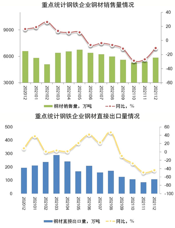 上述統(tǒng)計(jì)數(shù)據(jù)表明:受限產(chǎn)、限電、下游行業(yè)用鋼需求減弱等因素的影響,自2021年6月份以來(lái),重點(diǎn)統(tǒng)計(jì)鋼鐵企業(yè)鋼材銷(xiāo)售連續(xù)下降,但在振作工業(yè)經(jīng)濟(jì)運(yùn)行政策措施的引領(lǐng)下,鋼鐵行業(yè)需求逐步企穩(wěn)回升,日銷(xiāo)環(huán)比連續(xù)2個(gè)月上升。隨著國(guó)家取消鋼材出口退稅,鋼材出口同比連續(xù)4個(gè)月下降,鋼材直接出口量呈減少態(tài)勢(shì),雖然2021年12月份有所回升,環(huán)比上升26.40%,但仍處于低位。鋼材產(chǎn)銷(xiāo)率當(dāng)月小幅下降,鑒于季節(jié)性、環(huán)境性等多重因素對(duì)需求端的影響,鋼鐵供需變化仍需密切跟蹤和關(guān)注,以實(shí)現(xiàn)供需動(dòng)態(tài)平衡。