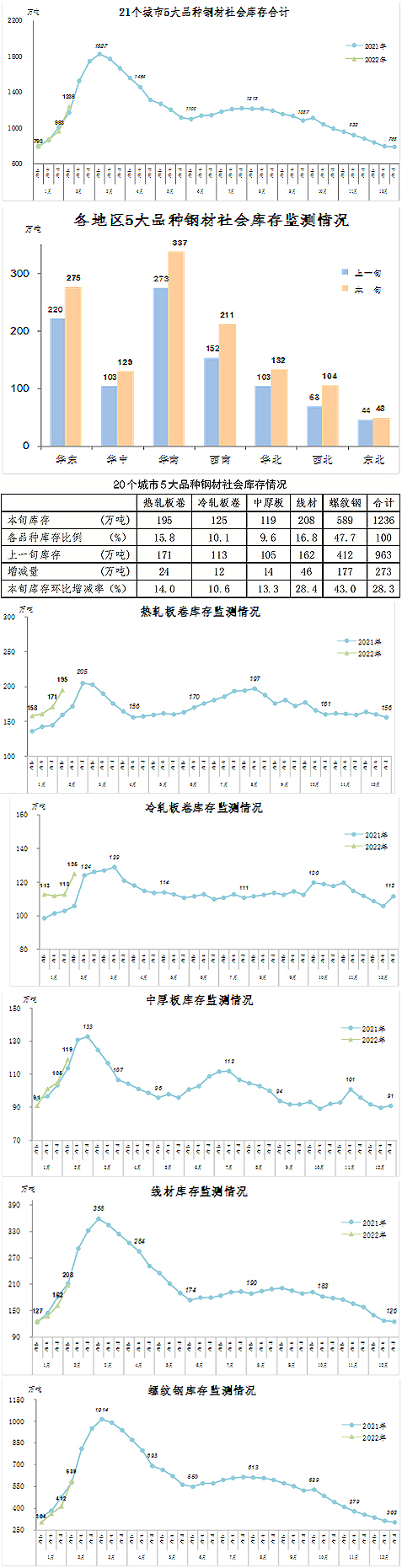 注:從2022年開始,鋼材社會(huì)庫存重點(diǎn)監(jiān)測(cè)城市由20個(gè)增加到21個(gè),增加城市為蘭州,旬報(bào)中社會(huì)庫存總量和5大品種庫存量的上年數(shù)據(jù)均同口徑做出調(diào)整。
