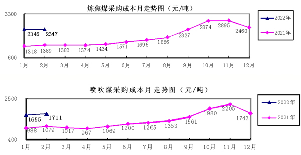 2月份,對標企業煉焦煤加權平均折算成干基的采購成本為2346.97元/噸,環比升高0.59元/噸,升幅為0.02%。1月~2月份,累計平均折算成干基的采購成本為2354.54元/噸,同比升高1000.91元/噸,升幅為73.94%。