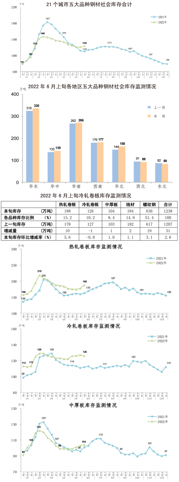 6月上旬,21個城市五大品種鋼材社會庫存為1238萬噸,環(huán)比增加31萬噸,上升2.6%,庫存連續(xù)9旬下降后首次回升;比今年初增加450萬噸,上升57.1%;同比增加138萬噸,上升12.5%。