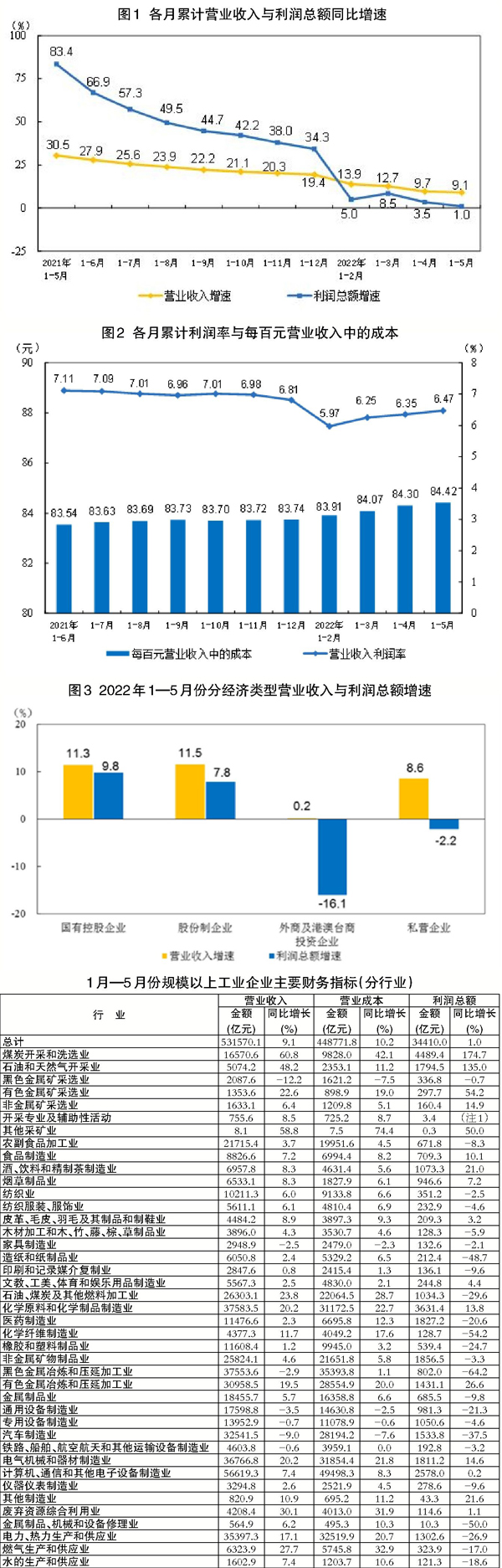 1月—5月份,采礦業實現利潤總額7082.7億元,同比增長1.31倍;制造業實現利潤總額25579.5億元,下降10.8%;電力、熱力、燃氣及水生產和供應業實現利潤總額1747.9億元,下降24.7%。在41個工業大類行業中,16個行業利潤總額同比增長,24個行業下降,1個行業由虧轉盈。主要行業利潤情況如下:煤炭開采和洗選業利潤總額同比增長1.75倍,石油和天然氣開采業增長1.35倍,有色金屬冶煉和壓延加工業增長26.6%,電氣機械和器材制造業增長14.6%,化學原料和化學制品制造業增長13.8%,計算機、通信和其他電子設備制造業增長0.2%,紡織業下降2.5%,非金屬礦物制品業下降3.3%,專用設備制造業下降4.6%,農副食品加工業下降8.3%,通用設備制造業下降21.3%,電力、熱力生產和供應業下降26.9%,石油、煤炭及其他燃料加工業下降29.6%,汽車制造業下降37.5%,黑色金屬冶煉和壓延加工業下降64.2%。