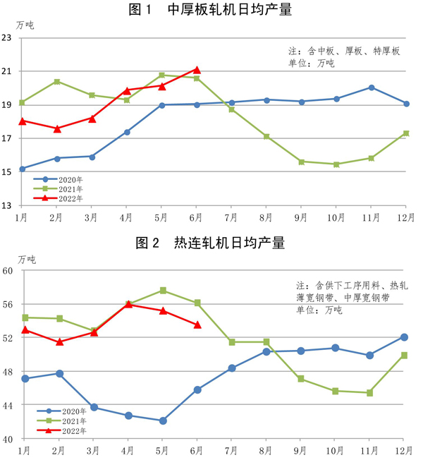 中厚板軋機6月份生產特厚板、中厚板634萬噸,同比增加11萬噸,上升1.8%。1月—6月份,累計生產3418萬噸,同比減少113萬噸,下降3.2%。熱連軋機6月份生產1606萬噸,同比減少85萬噸,下降5.0%。其中,商品量957萬噸,同比減少47萬噸,下降4.7%;供下工序用料648萬噸,同比減少38萬噸,下降5.6%。1月—6月份,熱連軋機累計生產9711萬噸,同比減少281萬噸,下降2.8%。冷連軋機6月份生產631萬噸,同比減少26萬噸,下降3.9%。其中,商品量427萬噸,同比減少24萬噸,下降5.4%;供下工序用料204萬噸,同比減少2萬噸,下降0.8%。1月—6月份,冷連軋機累計生產3914萬噸,同比減少81萬噸,下降2.0%。