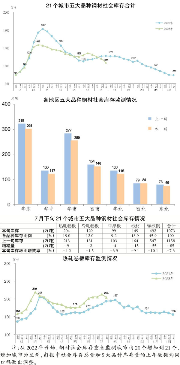 7月下旬,21個城市五大品種鋼材社會庫存為1073萬噸,環比減少85萬噸,下降7.3%,庫存降幅擴大;比6月下旬減少179萬噸,下降14.3%;比今年初增加285萬噸,上升36.2%;比去年同期減少149萬噸,下降12.2%。
