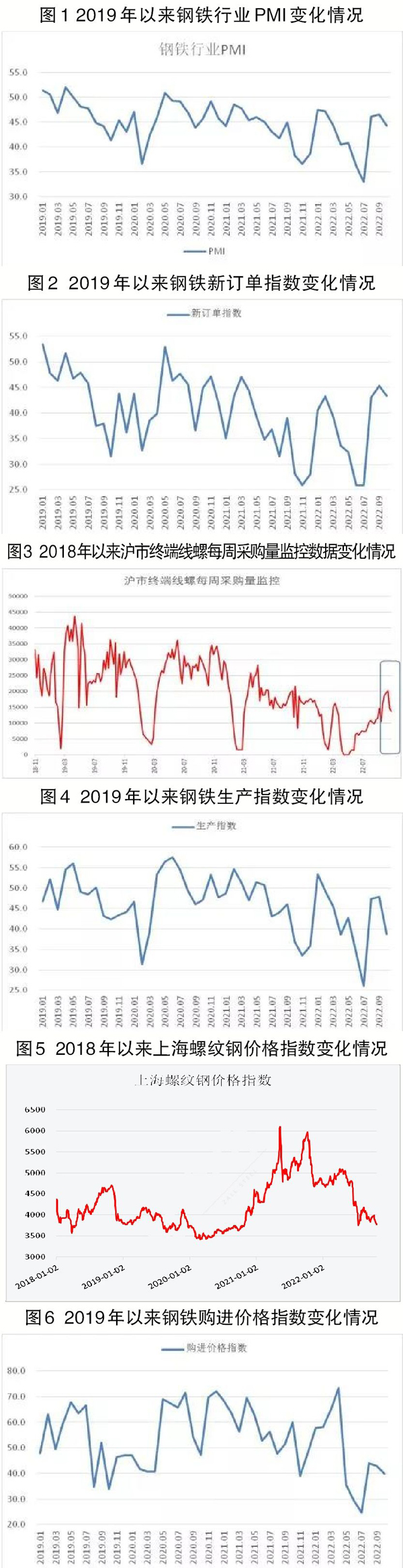 從中物聯鋼鐵物流專業委員會調查、發布的鋼鐵行業PMI(采購經理指數)來看,2022年10月份為44.3%,環比下降2.3個百分點,結束連續2個月環比回升勢頭,顯示鋼鐵行業運行有所波動。分項指數變化顯示,需求端呈現偏弱態勢,生產端整體有所下降,鋼鐵價格和原材料價格均呈現下降走勢,鋼廠普遍出現虧損。預計11月份,鋼材市場需求將穩中略降,鋼廠生產預計持穩運行,或有一定上升空間。在供需矛盾持續的情況下,鋼材價格或小幅下降。