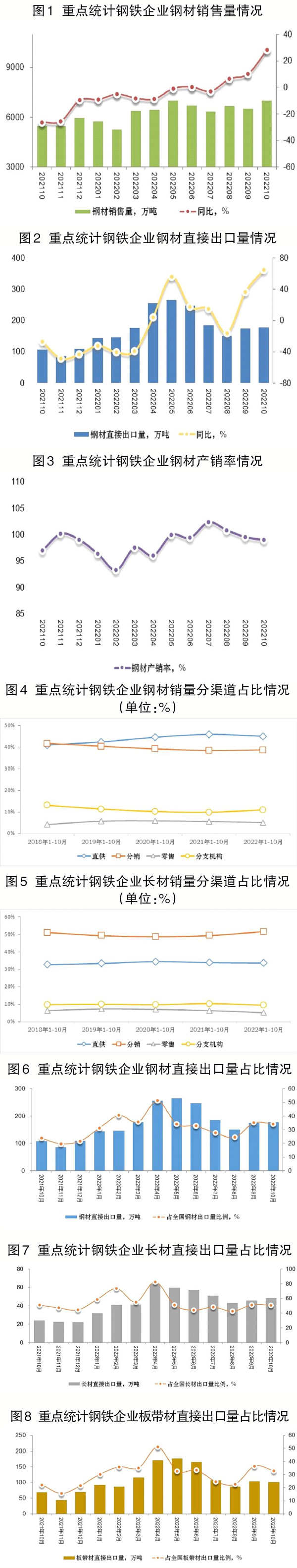 1月—10月份,重點統計鋼鐵企業鋼材直供銷量同比下降1.53%,占鋼材國內銷售量比例為45.07%;鋼材分銷銷量同比上升1.12%,占鋼材國內銷售量比例為38.77%;鋼材零售銷量同比下降7.89%,占鋼材國內銷售量比例為5.14%;鋼材分支機構銷量同比上升11.68%,占鋼材國內銷售量比例為11.02%。
