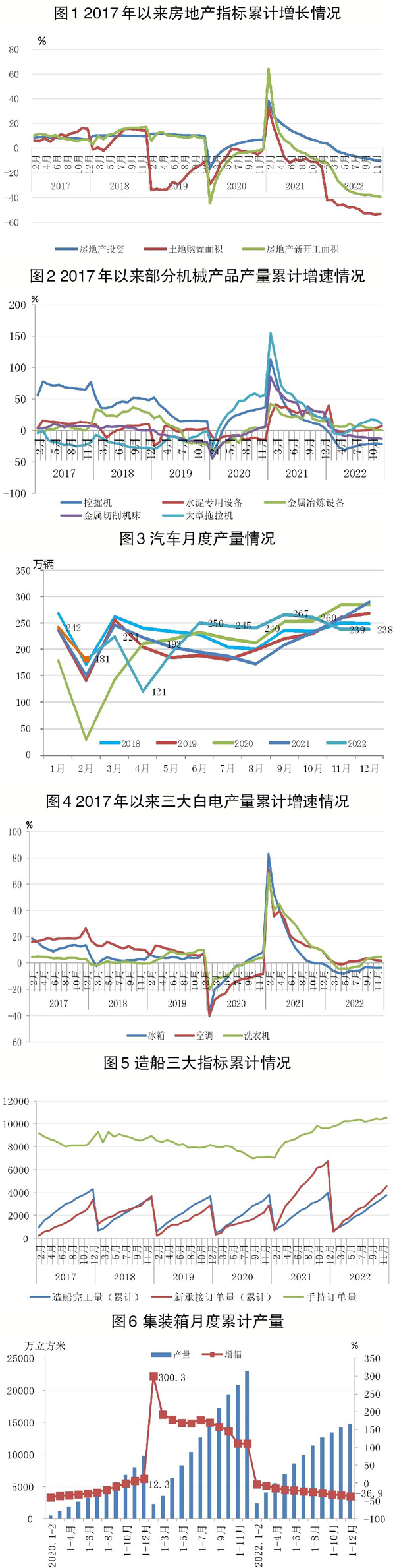 2022年,主要用鋼行業運行總體呈下行態勢。建筑業呈現分化態勢,其中房地產主要指標繼續下降,基礎設施建設投資保持較快增長。2022年,制造業總體運行穩定。其中,機械行業工業增加值保持增長,但機電產品出口額增幅持續收窄;汽車行業保持增長,在新能源汽車和出口市場方面表現亮眼;船舶行業總體平穩向好,手持訂單量持續增長;家電行業三大白電(空調、洗衣機、冰箱)產量兩升一降;集裝箱產量及出口量大幅回落。