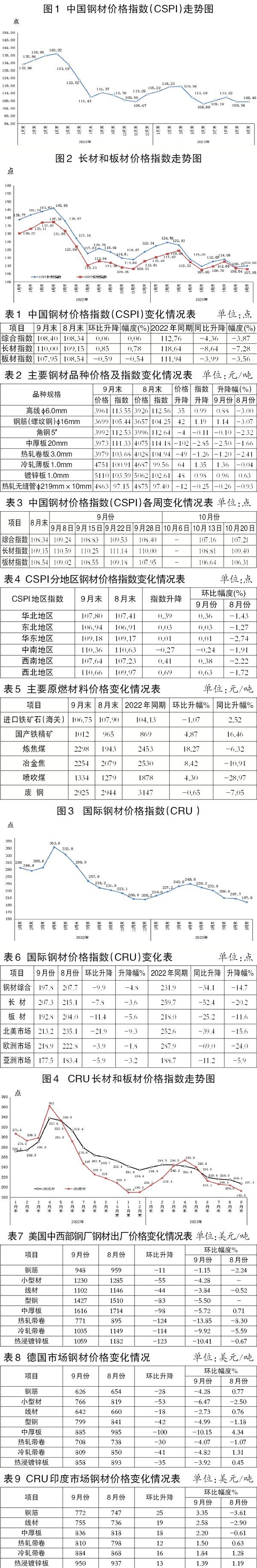 9月份,CSPI國內(nèi)鋼材綜合指數(shù)呈波動下行走勢,第一周、第三周上升,第二周、第四周下降。進入10月份以來,鋼價呈止跌趨穩(wěn)走勢。