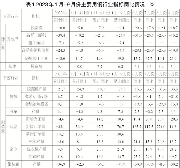 1月—9月份,主要用鋼行業(yè)運(yùn)行總體平穩(wěn)。一是建筑業(yè)持續(xù)低迷。其中,房地產(chǎn)主要指標(biāo)繼續(xù)下降,新開工量降幅略有收窄;基礎(chǔ)設(shè)施建設(shè)投資保持增長,增速繼續(xù)放緩。二是制造業(yè)總體平穩(wěn)增長。其中,機(jī)械工業(yè)增加值保持增長,機(jī)電產(chǎn)品出口額(美元值)降幅有所擴(kuò)大;汽車產(chǎn)量保持增長,其中新能源汽車產(chǎn)量和汽車出口量繼續(xù)保持快速增長;船舶行業(yè)三大指標(biāo)大幅上升,繼續(xù)保持向好態(tài)勢;家電行業(yè)三大白電(冰箱、空調(diào)、洗衣機(jī))產(chǎn)品產(chǎn)量保持增長,增幅有所收窄;集裝箱產(chǎn)量繼續(xù)下降。
