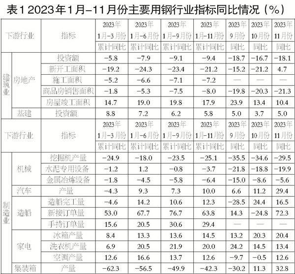 2023年1月—11月份,我國主要用鋼行業運行總體平穩。建筑業持續低迷。其中,房地產主要指標繼續下降,新開工面積和施工面積降幅略有收窄;基礎設施建設投資保持增長,增速繼續放緩。制造業總體穩中有增。其中,機械工業增加值保持增長,機電產品出口額(美元值)降幅收窄;汽車產量繼續保持高位,其中新能源汽車產量和汽車出口量繼續保持快速增長;船舶行業三大指標大幅上升,保持向好態勢;家電行業三大白電(空調、冰箱、洗衣機)產品產量保持較快增長;集裝箱產量繼續下降,降幅收窄。